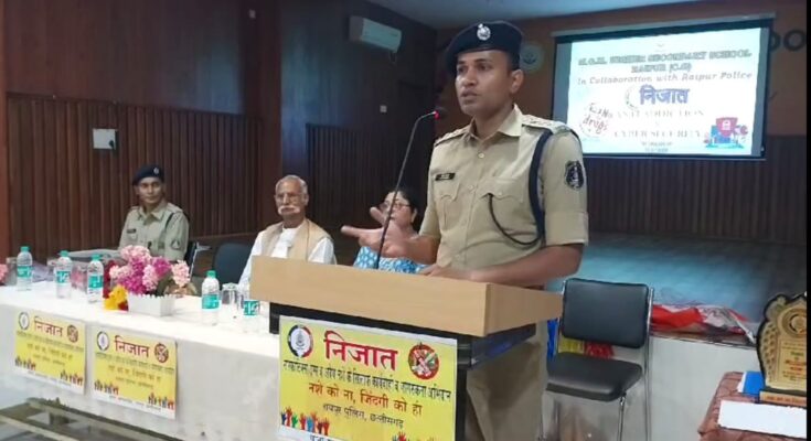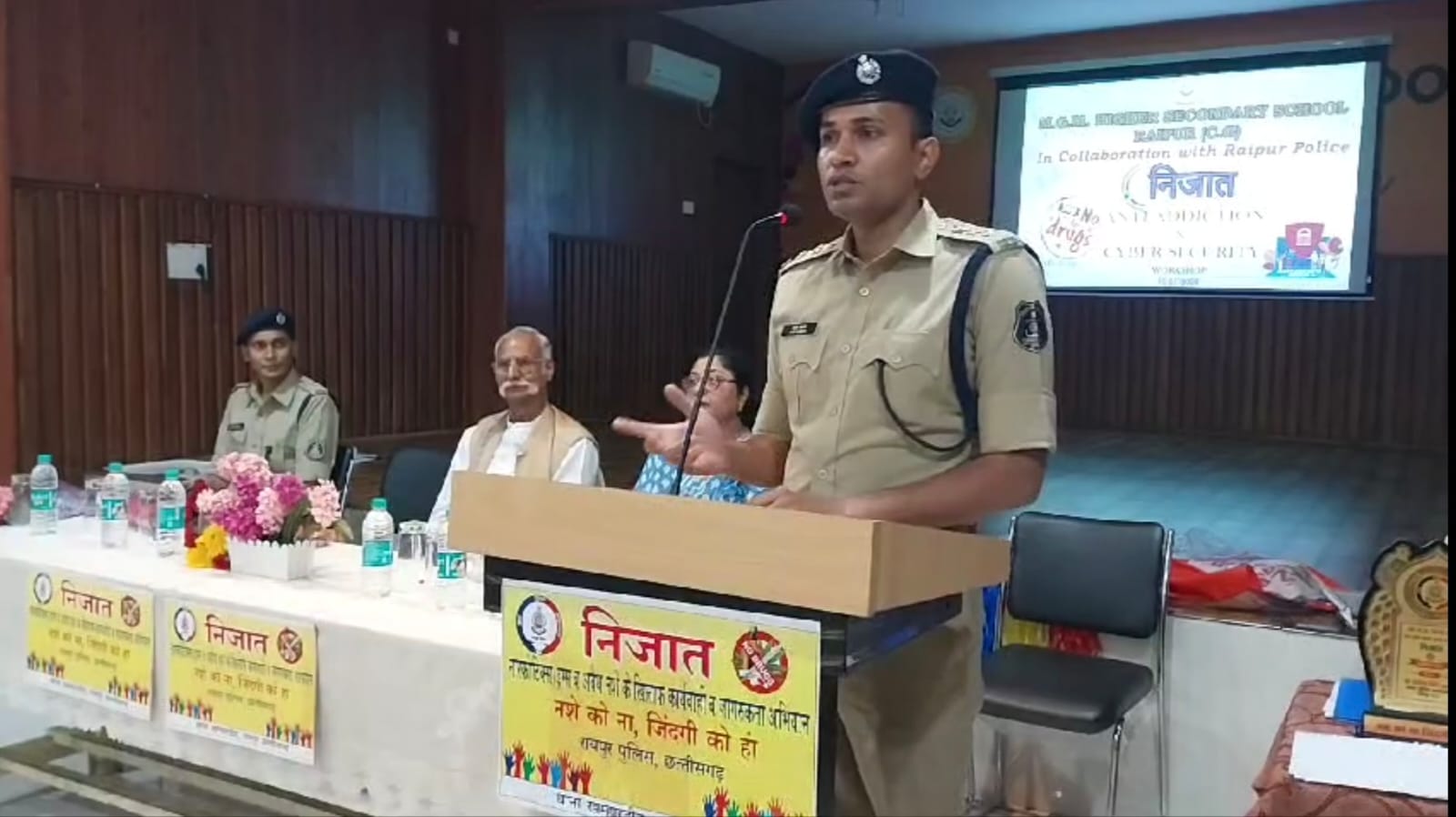 रायपुर। रायपुर पुलिस द्वारा जिले में नशा विरोधी कार्यवाही और जागरूकता अभियान निजात चलाया जा रहा है। इसके तहत एमजीएम स्कूल में निजात-नशा मुक्ति कार्यशाला का आयोजन किया गया। सीएसपी अजय कुमार ने बच्चों को अभियान के उद्देश्य को बताते हुए नशा एव अपराध से दूर रहकर कड़ी मेहनत से शिक्षा प्राप्त कर जीवन मे आगे बढ़ते रहने को प्रोत्साहित किया। उन्होंने कहा नशा जीवन के अधिकार के कुएं में ले जाता है। सीएसपी केशरी नंदन नायक ने नशा से होने वाले दुष्परिणाम के साथ साइबर अपराध से बचने के उपाय बताए।