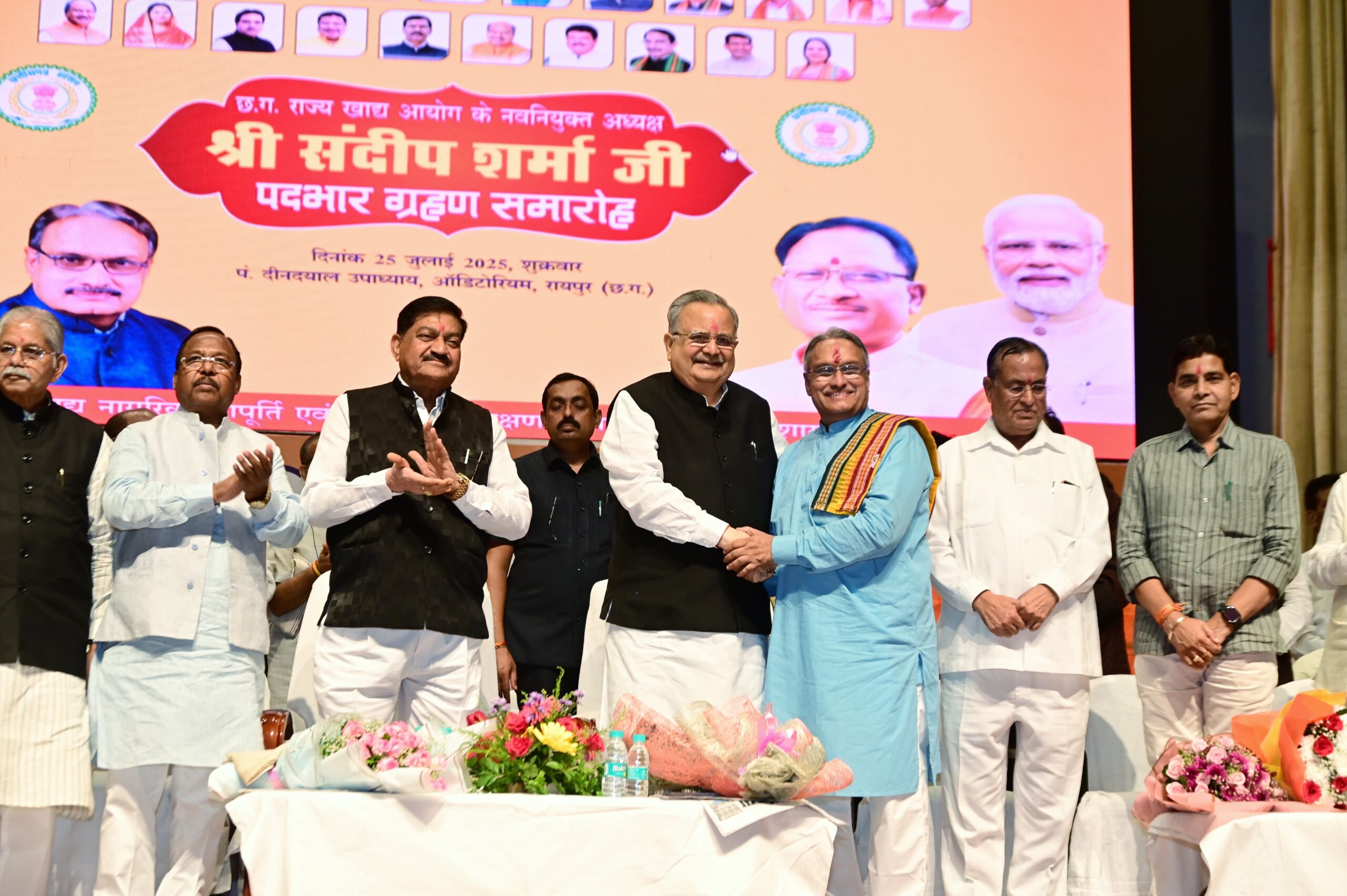 छत्तीसगढ़ राज्य खाद्य आयोग के नवनियुक्त अध्यक्ष संदीप शर्मा ने कहा कि भारतीय खाद्य सुरक्षा अधिनियम के अंतर्गत खाद्य आयोग का गठन किया गया है। प्रधानमंत्री नरेंद्र मोदी और मुख्यमंत्री विष्णु देव साय के नेतृत्व वाली भाजपा सरकार में लोगों को संवैधानिक अधिकार दिए हैं। हमारे अनेक मूलभूत अधिकारों में भोजन का अधिकार भी एक अधिकार है। देश में कोई भी व्यक्ति भूखा न रहे, कोई भी व्यक्ति रात में बिना भोजन के न सोए, इसकी चिंता मोदी जी के नेतृत्व वाली भाजपा सरकार ने की है। कोरोना काल में लोगों के भोजन के लिए अनाज की व्यवस्था की गई। कोरोना कल समाप्त होने के बाद भी केंद्र सरकार की यह योजना निरंतर चल रही है। शर्मा ने कहा कि हमारी सरकार गरीबों की चिंता करने वाली सरकार है। प्रदेश में निरंतर अनाज उत्पादन बढ़े, इसके लिए लगातार सरकार ने किसानों के लिए काम किया। जिस समय हमारे प्रदेश में अनाज का उत्पादन निरंतर बढ़ा, उसके पीछे रमन सिंह की सरकार ने बहुत काम किया। आज किसानों को उनके अनाज का उचित मूल्य मिल रहा है। धान का पैसा एकमुश्त मिल रहा है। 13 हजार करोड़ रुपए प्रतिवर्ष प्रदेश सरकार किसानों को दे रही है जिसकी वजह से खाद्यान्न उत्पादन तेजी से बढ़ रहा है।