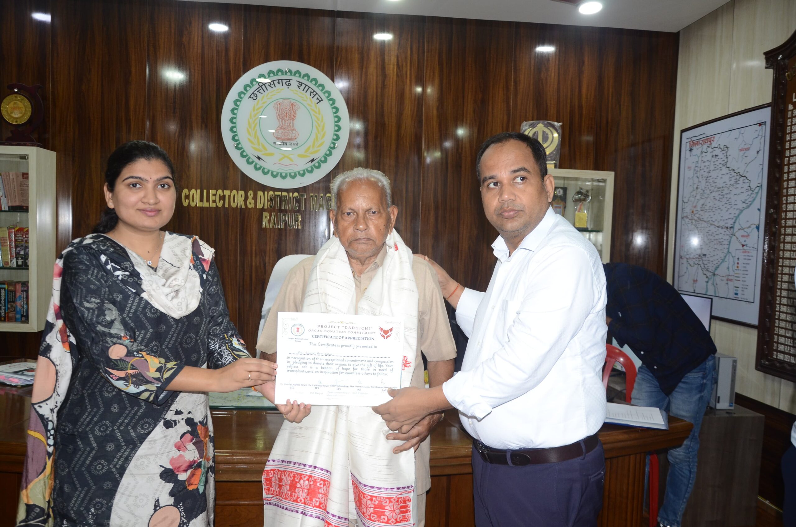 रायपुर। मैं मरणोपरांत मेडिकल के छात्र-छात्राओं के परिक्षण में काम आ सकूं इस आशा के साथ सेवानिवृत्त स्वास्थ्य पर्यवेक्षक भरतराम साहू ने “प्रोजेक्ट दधीचि” के अंतर्गत संपूर्ण देहदान का संकल्प लेकर समाज के लिए एक प्रेरणादायक मिसाल पेश की है। मुख्यमंत्री विष्णुदेव साय की मंशानुरूप जिले में प्रोजेक्ट दधीचि का संचालन किया जा रहा है। इसके तहत आमजन आगे आकर अपनी भागीदारी दे रहे है। आज कलेक्टर डॉ. गौरव सिंह ने भरतराम साहू को इस मानवीय निर्णय के लिए शॉल तथा प्रेरक पुस्तक देकर एवं अपर कलेक्टर सुश्री नम्रता जैन (आईएएस) ने प्रशस्ति पत्र प्रदान कर उन्हें सम्मानित किया।