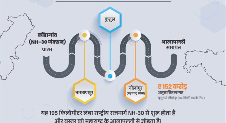 रायपुर। बस्तर अंचल को महाराष्ट्र से जोड़ने वाले राष्ट्रीय राजमार्ग 130-डी के निर्माण को नई गति मिली है। छत्तीसगढ़ शासन ने कुतुल से नीलांगुर (महाराष्ट्र सीमा) तक 21.5 किलोमीटर हिस्से के निर्माण के लिए टेंडर प्रक्रिया पूरी कर ली है। इस सड़क के निर्माण के लिए न्यूनतम टेंडर देने वाले ठेकेदार से अनुबंध की प्रक्रिया शर्तों सहित पूरी करने के निर्देश लोक निर्माण विभाग मंत्रालय द्वारा प्रमुख अभियंता, राष्ट्रीय राजमार्ग परिक्षेत्र रायपुर को दिए गए हैं। कुल तीन खंडों में निर्मित होने वाले 21.5 किलोमीटर सड़क के निर्माण हेतु लगभग 152 करोड़ रुपए न्यूनतम टेंडर दर प्राप्त हुई है, जिसे छत्तीसगढ़ शासन ने मंजूरी प्रदान कर दी है। उल्लेखनीय है कि कुतुल, नारायणपुर जिले के अबूझमाड़ क्षेत्र में स्थित है और कुतुल से महाराष्ट्र सीमा पर स्थित नीलांगुर की दूरी 21.5 किलोमीटर है। यह नेशनल हाईवे 130-डी का हिस्सा है। इस सड़क का निर्माण टू-लेन पेव्ड शोल्डर सहित किया जाएगा।