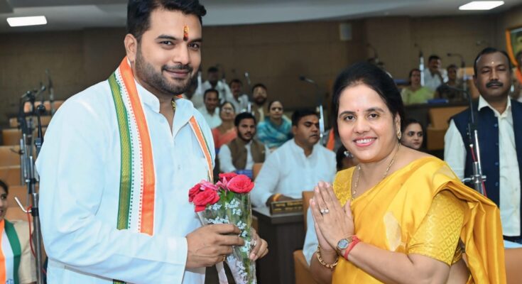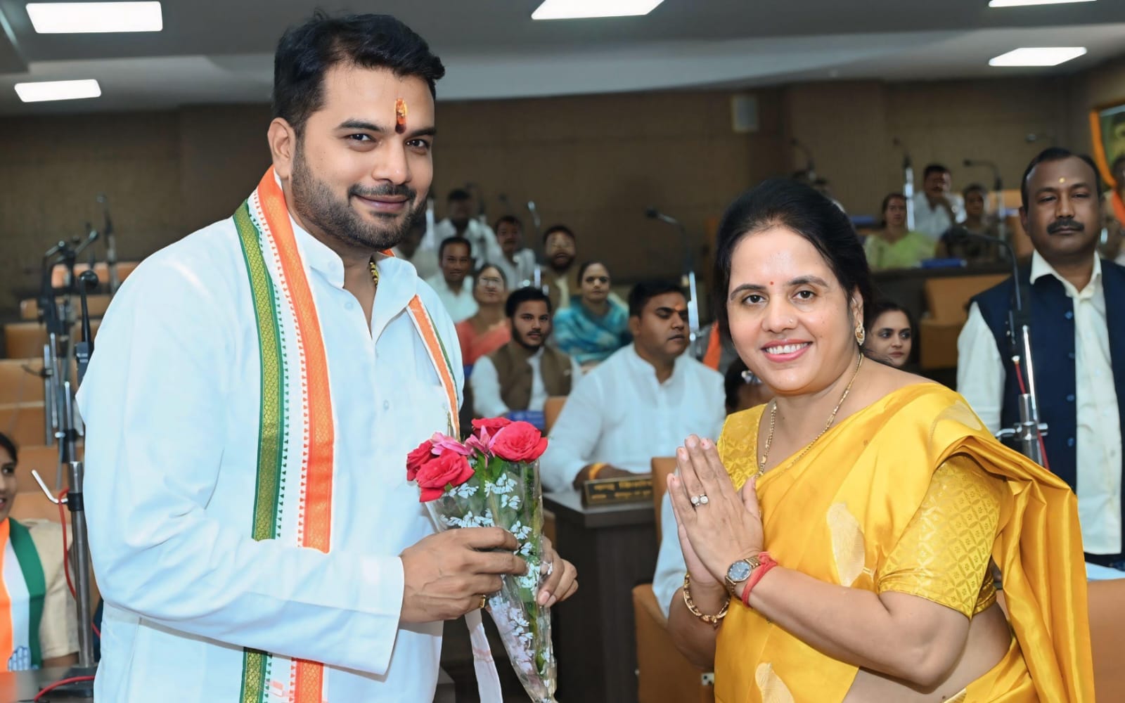 रायपुर। नगर निगम की सामान्य सभा में आज आकाश तिवारी नेता प्रतिपक्ष की हैसियत से शामिल हुए। सदन की कार्यवाही शुरु होते ही महापौर श्रीमती मीनल चौबे ने बुके देकर नये नेता प्रतिपक्ष आकाश तिवारी का स्वागत किया। नगर निगम सचिव श्रीमती संगीता साहू ने भी नये नेता प्रतिपक्ष को बुके देकर सदन में उनका स्वागत किया। उल्लेखनीय कि समान्य सभा से ठीक एक दिन पहले कल 28 अक्टूर को नगर निगम सभापति सूर्यकांत राठौड़ ने आकाश तिवारी को नेता प्रतिपक्ष के रूप में अधिमान्यता देने पत्र जारी किया था।