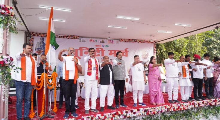 रायपुर। भारतीय इतिहास के लौह पुरुष, देश की एकता और अखंडता के शिल्पी सरदार वल्लभ भाई पटेल की 150 वीं जयंती के उपलक्ष्य में राजधानी रायपुर में शुक्रवार को ऐतिहासिक ‘सरदार @150 यूनिटी मार्च पदयात्रा’ सांसद एवं वरिष्ठ भाजपा नेता बृजमोहन अग्रवाल के नेतृत्व में निकली। पदयात्रा में मंत्री, विधायक, निगम मंडल आयोग अध्यक्ष, इतिहासकार, साहित्यकार समेत एनसीसी, एनएसएस रेड क्रॉस के कैडेट व स्कूली छात्र शामिल हुए। यह आयोजन जिला प्रशासन, नगर निगम, खेल एवं युवा कल्याण विभाग, भाजपा रायपुर शहर एवं ग्रामीण जिला तथा माई भारत के संयुक्त तत्वावधान में हुआ।