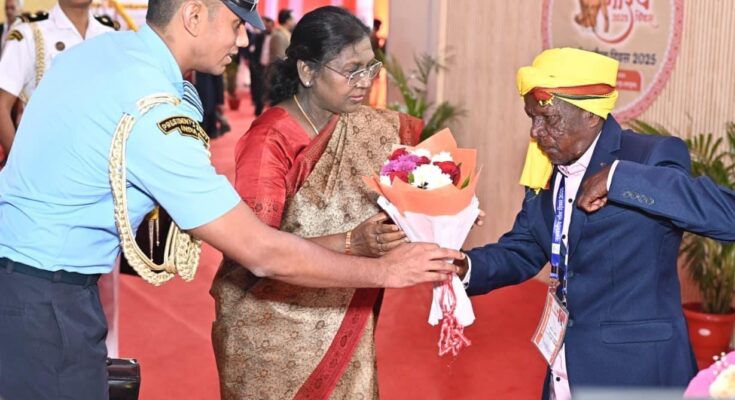 रायपुर। राष्ट्रपति श्रीमती द्रौपदी मुर्मु जनजातीय गौरव दिवस 2025 के उपलक्ष्य में सरगुजा जिले में 20 नवम्बर को पीजी कॉलेज ग्राउण्ड में आयोजित कार्यक्रम में मुख्य अतिथि के रूप में शामिल हुईं। कार्यक्रम में राज्यपाल रमेन डेका, मुख्यमंत्री विष्णुदेव साय, राज्यमंत्री जनजातीय कार्य मंत्रालय भारत सरकार दुर्गा दास उईके तथा राज्यमंत्री आवास एवं शहरी मंत्रालय भारत सरकार तोखन साहू विशेष रूप से उपस्थित थे। कार्यक्रम में राष्ट्रपति श्रीमती मुर्मु ने जनजातीय समाज प्रमुखों, पीवीटीजी समुदाय के समाज प्रमुखों, जनजातीय समाज के उत्थान में विशेष योगदान देने वालों, जनजातीय स्वतंत्रता संग्राम में सेनानियों के परिजनों से भेंट की। श्रीमती मुर्मू ने इन सभी के साथ समूह फोटो खिंचवाई। राष्ट्रपति श्रीमती मुर्मु ने देश के स्वतंत्रता संग्राम में योगदान देने वाले जनजातीय जननायकों एवं सेनानियों के परिजनों का सम्मान किया।