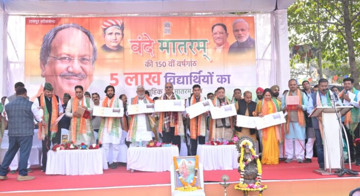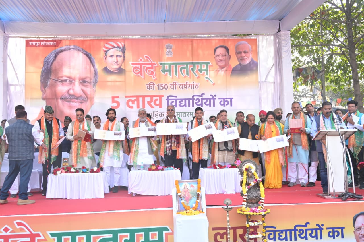 रायपुर। वंदे मातरम की 150 वीं वर्षगांठ के अवसर पर रायपुर लोकसभा क्षेत्र में ऐतिहासिक आयोजन संपन्न हुआ। कार्यक्रम में मुख्य अतिथि के रूप में उच्च शिक्षा एवं राजस्व मंत्री टंकराम वर्मा तथा विशिष्ट अतिथि के रूप में कौशल विकास, तकनीकी शिक्षा एवं रोजगार मंत्री गुरु खुशवंत साहेब उपस्थित थे। वंदे मातरम् की 150वीं वर्षगांठ पर रायपुर सांसद बृजमोहन अग्रवाल के नेतृत्व में पांच लाख विद्यार्थियों द्वारा सामूहिक गायन एक ऐतिहासिक पहल रही। उन्होंने आयोजन के लिए सभी को बधाई दी।